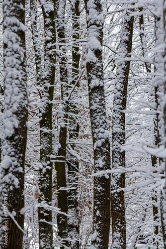 © Oleh Marchak, Fototapeta premium Temperate, deciduous forest with snow covered hornbeam Carpinus betulus trees