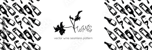 © Design Couple, Naklejka premium Template banner with red wine bottles pattern seamless. Hand-drawn coal sketches of red wine and white wine in vector. Winery frame design, grape alcohol pattern.