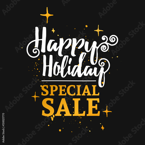 Fototapeta premium Template design banner for Christmas sales. Happy holidays special offer at a discount. Poster lettering for xmas discounts with the decor of gold and curls. Black background. Vector.