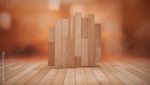 © Kartik, Fototapeta premium Template of beige wooden floor made of planks on blurred orange background