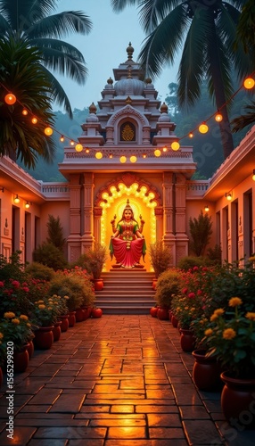 Fototapeta premium Temple decorated with marigold garlands and lights for traditional Indian...