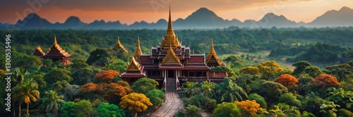 © yevhen89, Fototapeta premium Temple in Forest, Golden Architecture with Pathway, Green Landscape, Tropical Ambiance from Above.
