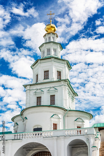 © Анна Демидова, Obraz premium Temple new jerusalem. Exterior. Magnificent architecture on a summer day against the backdrop of a bright blue cloudy sky. Vertical.