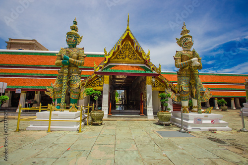Naklejka premium Temple of the Emerald Buddha - Wat Phra Si Rattana Satsadaram / Wat Phra Kaew-Bangkok: June 13, 2020, tourists visit to see the beauty of The Grand Palace, in Phra Nakhon District, Thailand.