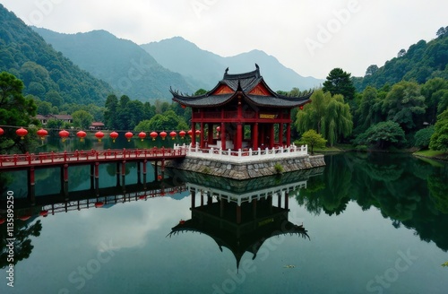 © Dmitrii, Fototapeta premium Temple Reflected on Serene Lake with Lantern Decor