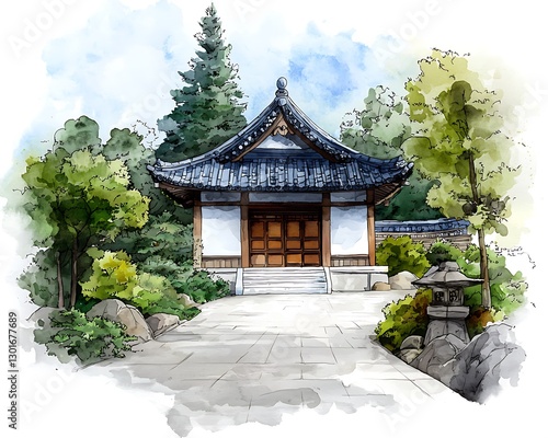 Fototapeta premium Temple stands in a lush garden; trees in background; graphic design element...