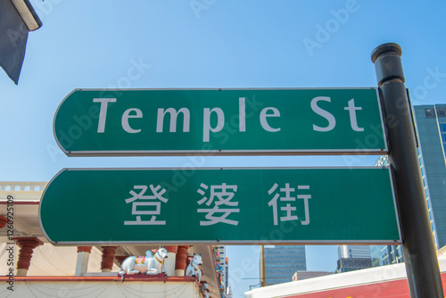 Obraz premium Temple Street road sign in both English and Chinese characters at South...