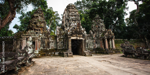 Fototapeta premium Temples of Angkor Wat where the jungle has partially overgrown the ruins near the city of Siem Reap in Cambodia