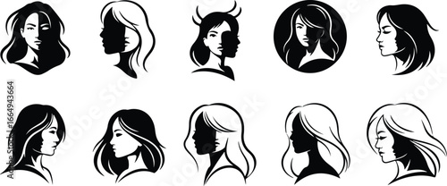 © hafsa01, Naklejka premium Ten black and white graphic silhouettes of women's faces and hairstyles woman profile