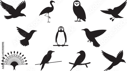 Obraz premium Ten Black Bird Silhouettes Icon Set Eagle Flamingo Owl Penguin Various Birds Flight Perch vector