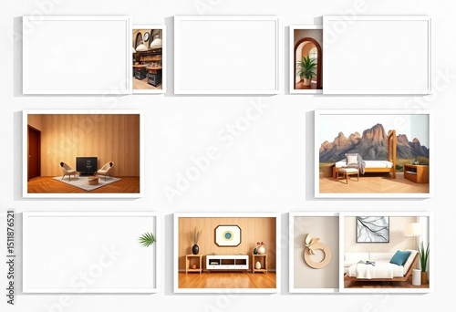 © Views & Backgrounds, Obraz premium Ten-frame vector collage template for photo album or interior design presentations; ample empty space for images, grid, format