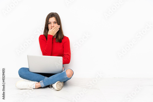 © luismolinero, Naklejka premium Tenaager girl working with pc isolated on white background covering mouth with hands