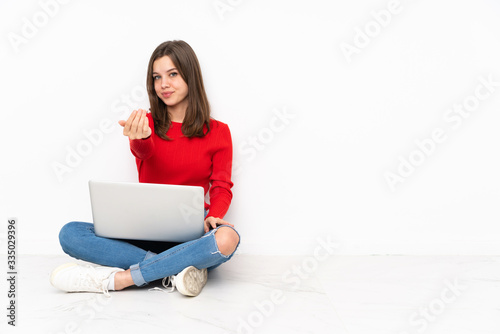 Naklejka premium Tenaager girl working with pc isolated on white background inviting to come...