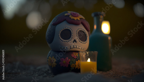Naklejka premium Tender Dia de Muertos Figurine and Candle Scene, Generative AI