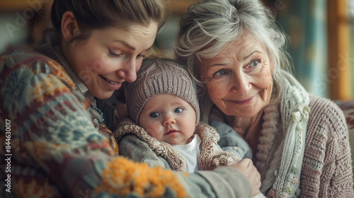 Obraz premium Tender Family Moment: Elderly Grandmother, Young Mother, and Baby Wearing...