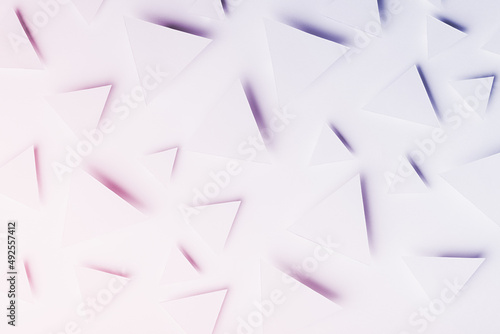 © finepoints, Fototapeta premium Tender geometric pattern of flying triangles in trendy very peri and pink color in shining light with soft light shadows in random, top view. Minimalist softness romantic modern abstract background.