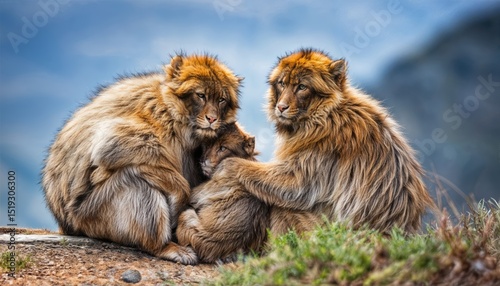 © netsay, Naklejka premium Tender Moment Amongst Barbary Macaques in Moroccos Atlas Mountains, Portraying Playful Friendship and Harmony Amidst the Rugged Landscape