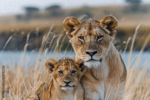 © Larisa AI, Obraz premium Tender moment between a lioness and her cub, nestled together in a grassy plain