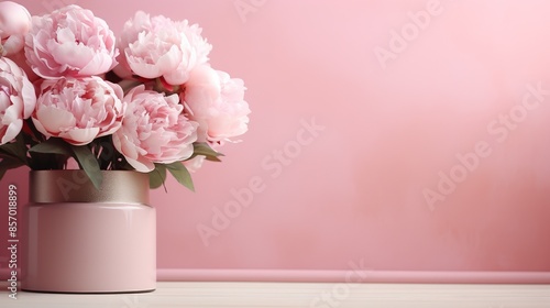 © Nitin, Naklejka premium Tender peonies on pink background with copy space. Abstract natural floral frame layout with text space. Romantic feminine composition
