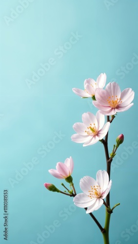 Fototapeta premium Tender spring flowers on a soft blue background, space for text on the right,...