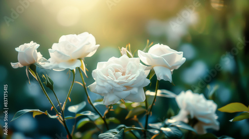© dianacrimea, Obraz premium Tender white roses blossom on the stem. Green blurred background behind