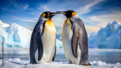 Fototapeta premium Tenderly embracing, two majestic emperor penguins stand on Antarctic ice,...