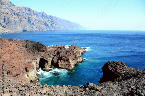 Naklejka premium TENERIFE, SPAIN: Scenic seashore view of Los Gigantes ancient rocks with blue sea waters