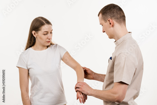 © Rabizo Anatolii, Obraz premium Tennis elbow, or lateral epicondylitis is painful condition of the elbow joint caused by overuse. Orthopedist traumatologist examines elbow joint with pain and prescribes treatment for girl patient.