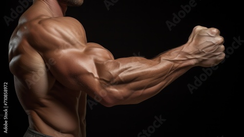 Fototapeta premium tense arm clenched into fist, veins, bodybuilder muscles on a dark background. Neural network AI generated art