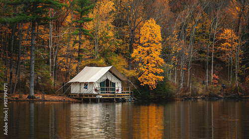 © Jioo7, Obraz premium Tent in the autumn forest. Camping in the forest.
