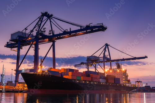 © Maha Heang 245789, Obraz premium Terminal container loading at twilight, Cargo and shipping, Logistics yard