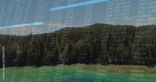 Fototapeta premium Terminal overlay displaying codes and 'ERROR' entries over turquoise lake and...