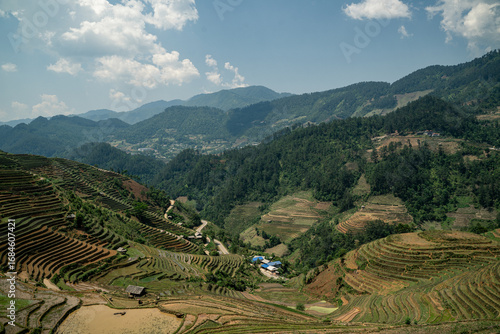 © Atthapon, Fototapeta premium Terrace fields blanket the green mountains of Vietnam, where rice agriculture thrives-an iconic Asian landscape that draws nature and travel lovers alike.