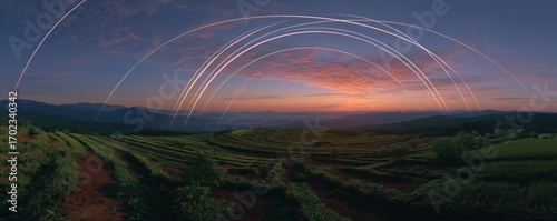 Obraz premium Terraced Fields at Sunset with Light Trails in Ultrawide View