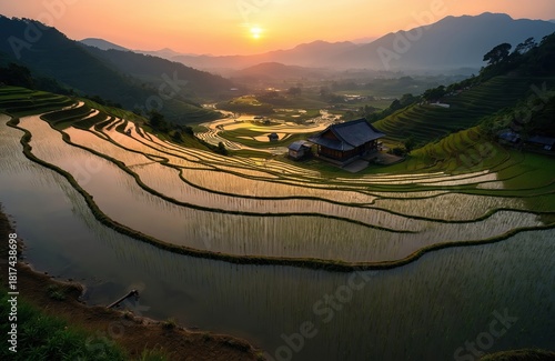 © Pete, Obraz premium Terraced rice fields reflect golden sunset light near a traditional Asian village home. Lush green plants grow on steep hills. Farming landscape shows water pools, a peaceful evening view.