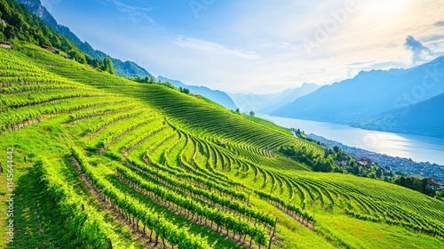 © Monchisa, Fototapeta premium Terraced Vineyard on Hillside Overlooking Lake and Mountains