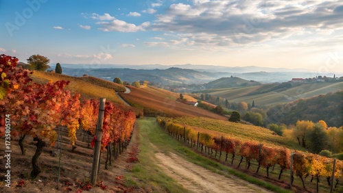 Naklejka premium Terraced vineyards display vibrant autumn colors over rolling Italian hills...
