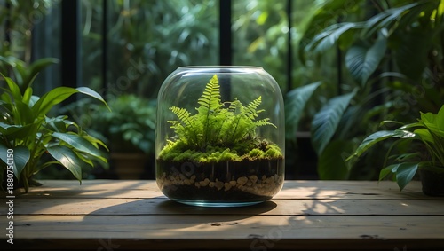 Fototapeta premium Terrarium with Fern on Wooden Table in Greenhouse
