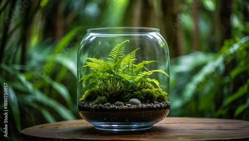 Fototapeta premium Terrarium with Ferns on Wooden Table in Lush Garden