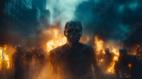 Obraz premium Terrifying Zombie Horde Marching through Burning City at Night with...