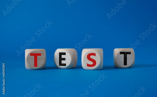 © Natallia, Obraz premium Test symbol. Concept word Test on wooden cubes. Beautiful blue background. Business and Test concept. Copy space.