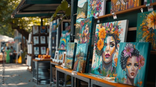 © pawimon, Naklejka premium Tętniące życiem targi sztuki Skup się na targach sztuki z różnorodnymi kolorowymi dziełami sztuki, z uroczystym tłem na świeżym powietrzu,