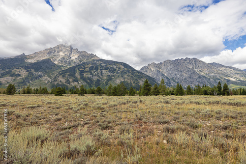 Fototapeta premium Teton Range with Teewinot Mountain and Mount Saint John near Jenny Lake in...
