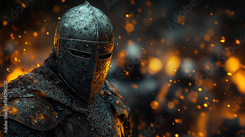 © Dusko, Fototapeta premium Teutonic Knight in Full Armor with Sword, Medieval Templar Warrior Standing in Battle Stance on Historic Battlefield in the Middle Ages, Dramatic Light and Historical Setting