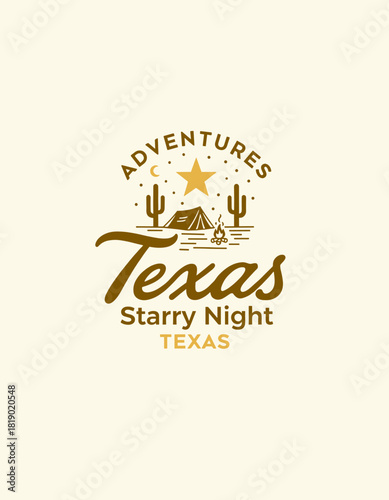 © brutalism studio, Fototapeta premium Texas starry-night campsite emblem—cacti frame a tent and fire under a crescent moon; simple vector linework with warm retro tones.