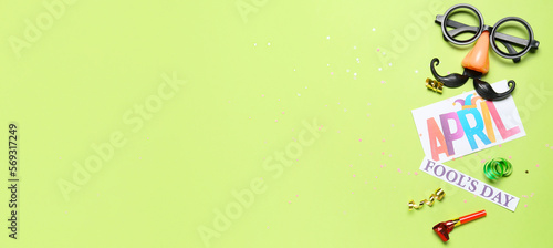 © Pixel-Shot, Obraz premium Text APRIL FOOL'S DAY and party decor on green background with space for text