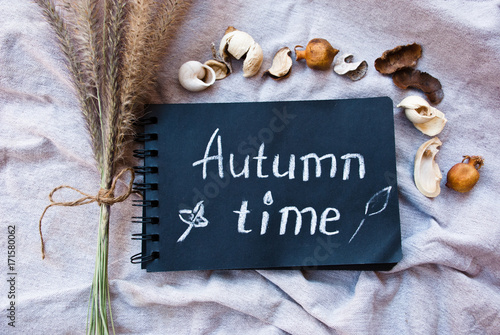© Etnika, Naklejka premium Text Autumn Time on black paper and fall decor elements. Fall background.