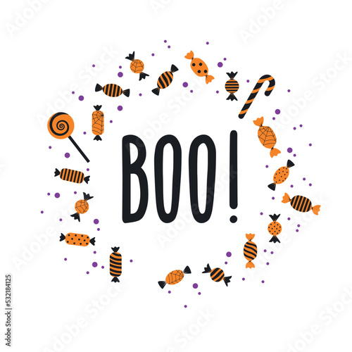 Fototapeta premium Text Boo! surrounded by sweets. Composition for Halloween. Vector illustration