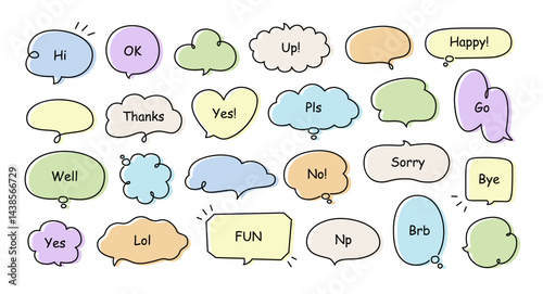 Fototapeta premium Text bubble. Simple text speech bubbles and chatting box, thinking clouds, comic talk message, fun words like hi and lol, brb and OK, thanks and yes, sorry. Vector set