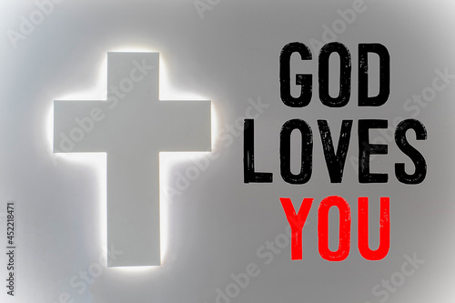 Fototapeta premium text God loves you, concept and white cross with light around the edges